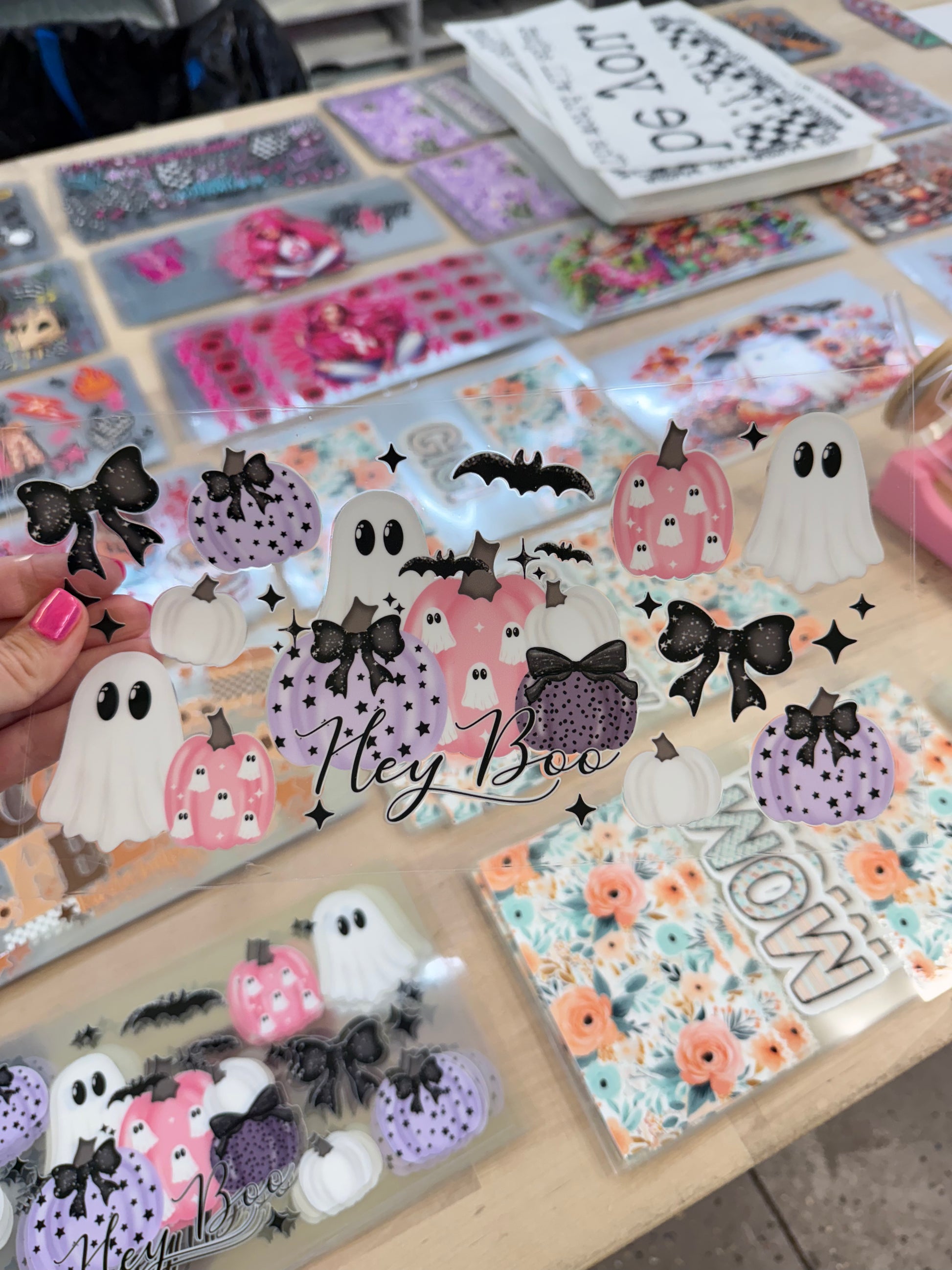 RTS HEY BOO PINK PURPLE PUMPKINS HALLOWEEN FALL UV DTF 16OZ CUP WRAP